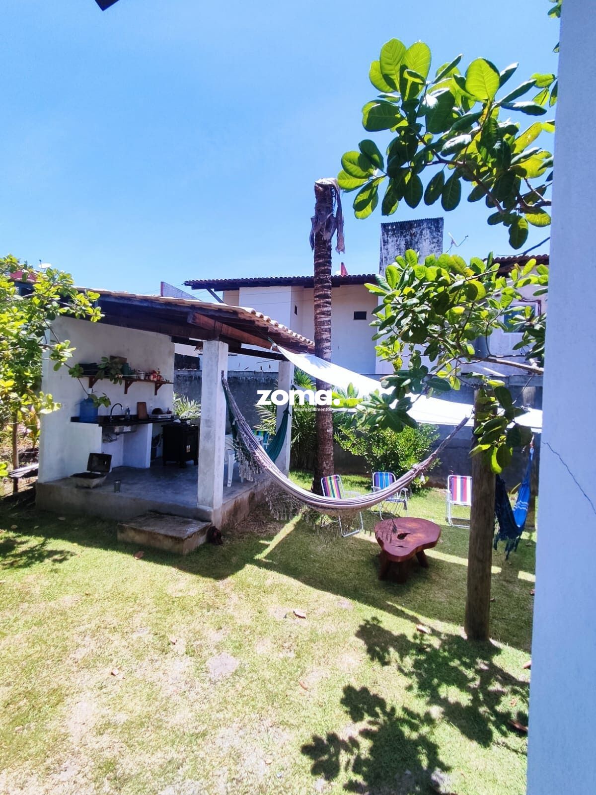 (conhecido como Aibim) passando ao fundo. Com terreno gramado, possui coqueiros, romãs plantados e cajueiros nativos,